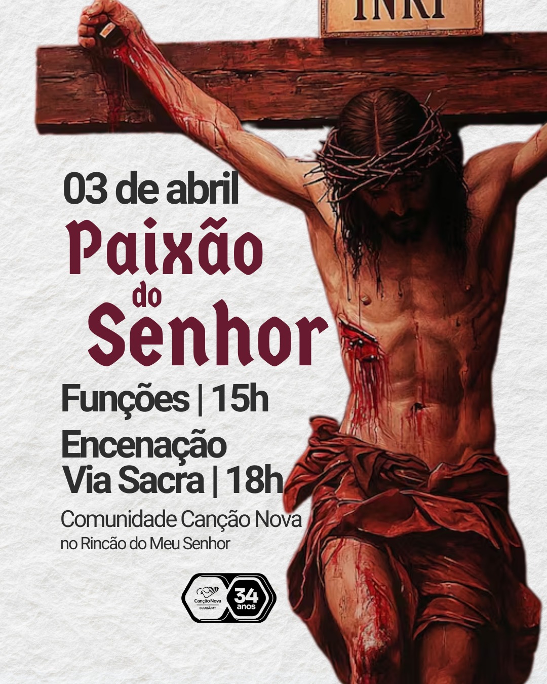 – 3 de abril (sexta-feira) Funções da Paixão às 15h e encenação da Via Sacra às 18h